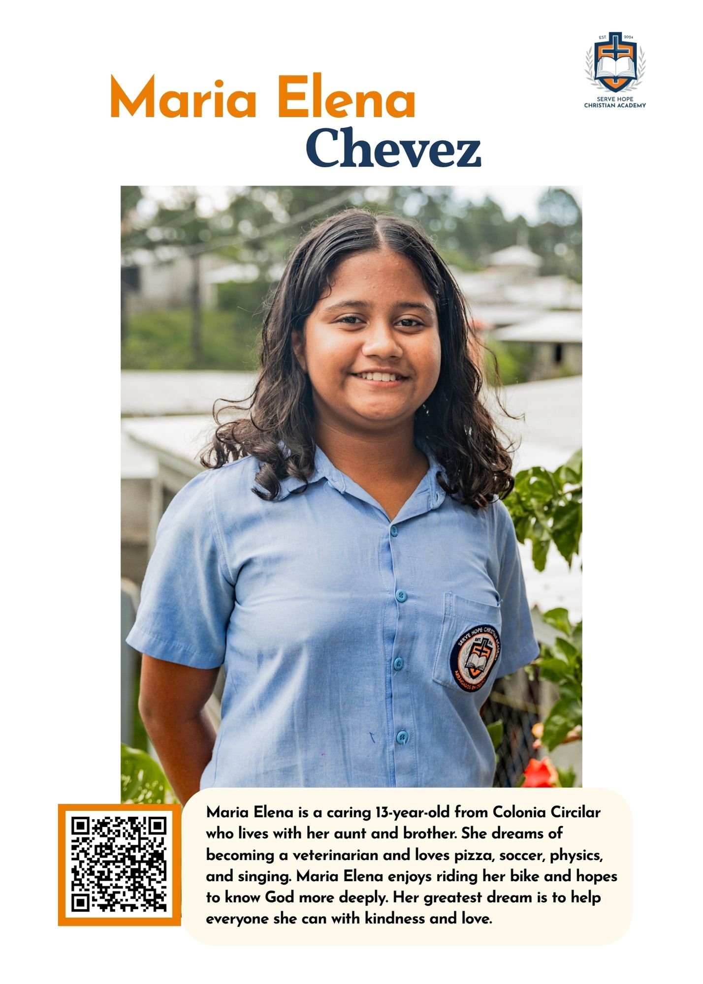 Maria Elena is a caring 13-year-old who lost his dad in an accident, now she lives with her aunt and brother. She dreams of becoming a veterinarian and loves pizza, soccer, physics, and singing. Maria Elena enjoys riding her bike and hopes to know God more deeply. Her greatest dream is to help everyone she can with kindness and love.