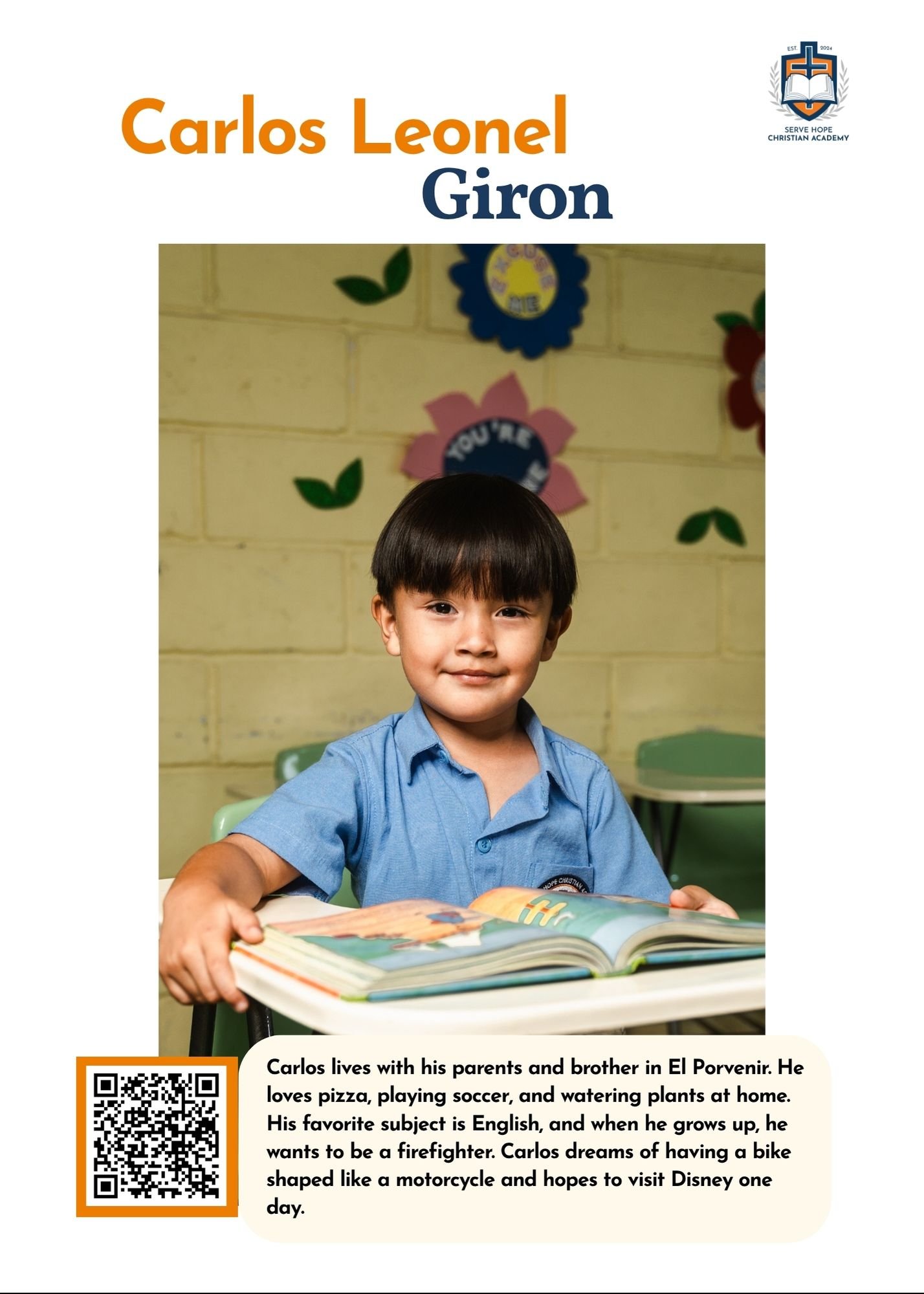 Carlos lives with his parents and brother in El Porvenir. He loves pizza, playing soccer, and watering plants at home. His favorite subject is English, and when he grows up, he wants to be a firefighter. Carlos dreams of having a bike shaped like a motorcycle and hopes to visit Disney one day.