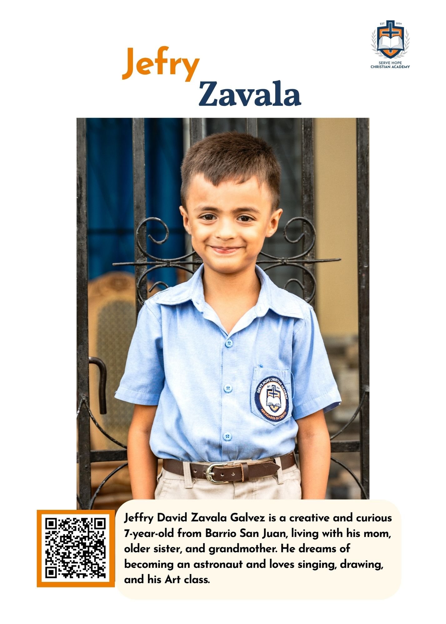 Jeffry David Zavala Galvez is a creative and curious 7-year-old from Barrio San Juan, living with his mom, older sister, and grandmother. He dreams of becoming an astronaut and loves singing, drawing, and his Art class.
