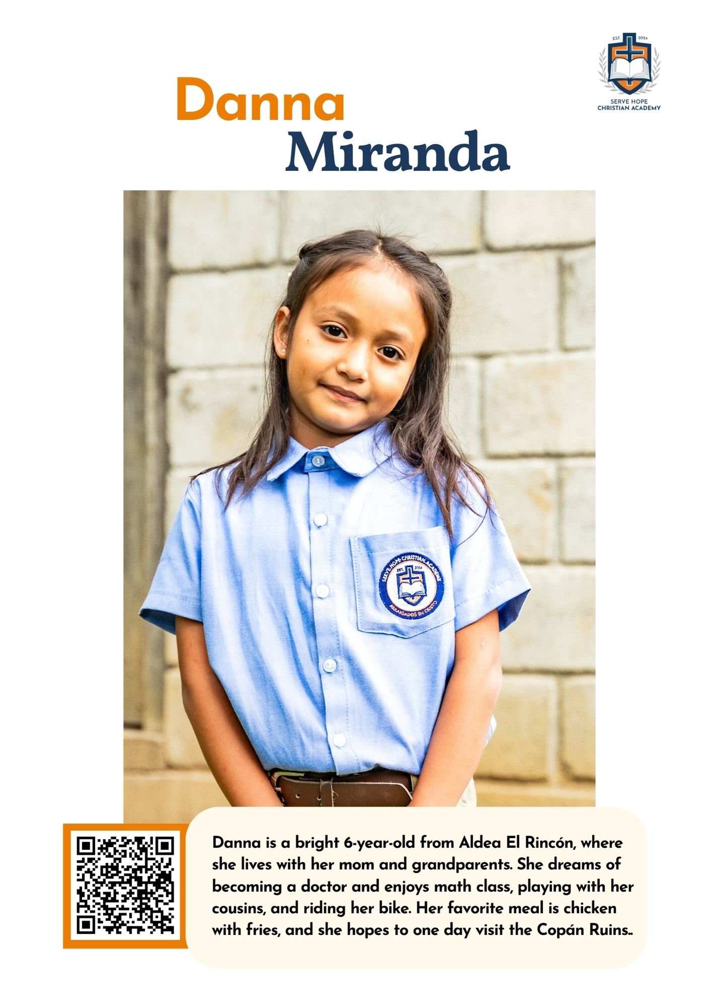 Danna is a bright 6-year-old from Aldea El Rincón, where she lives with her mom and grandparents. She dreams of becoming a doctor and enjoys math class, playing with her cousins, and riding her bike. Her favorite meal is chicken with fries, and she hopes to one day visit the Copán Ruins..