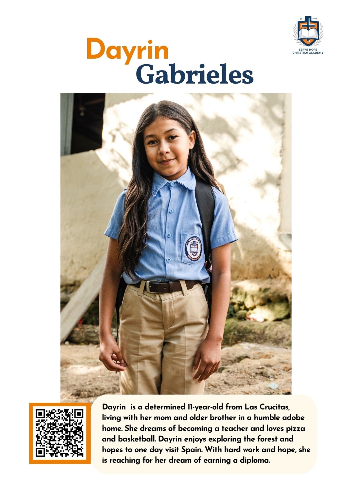 Dayrin is a determined 11-year-old from Las Crucitas, living with her mom and older brother in a humble adobe home. She dreams of becoming a teacher and loves pizza and basketball. Dayrin enjoys exploring the forest and hopes to one day visit Spain. With hard work and hope, she is reaching for her dream of earning a diploma.