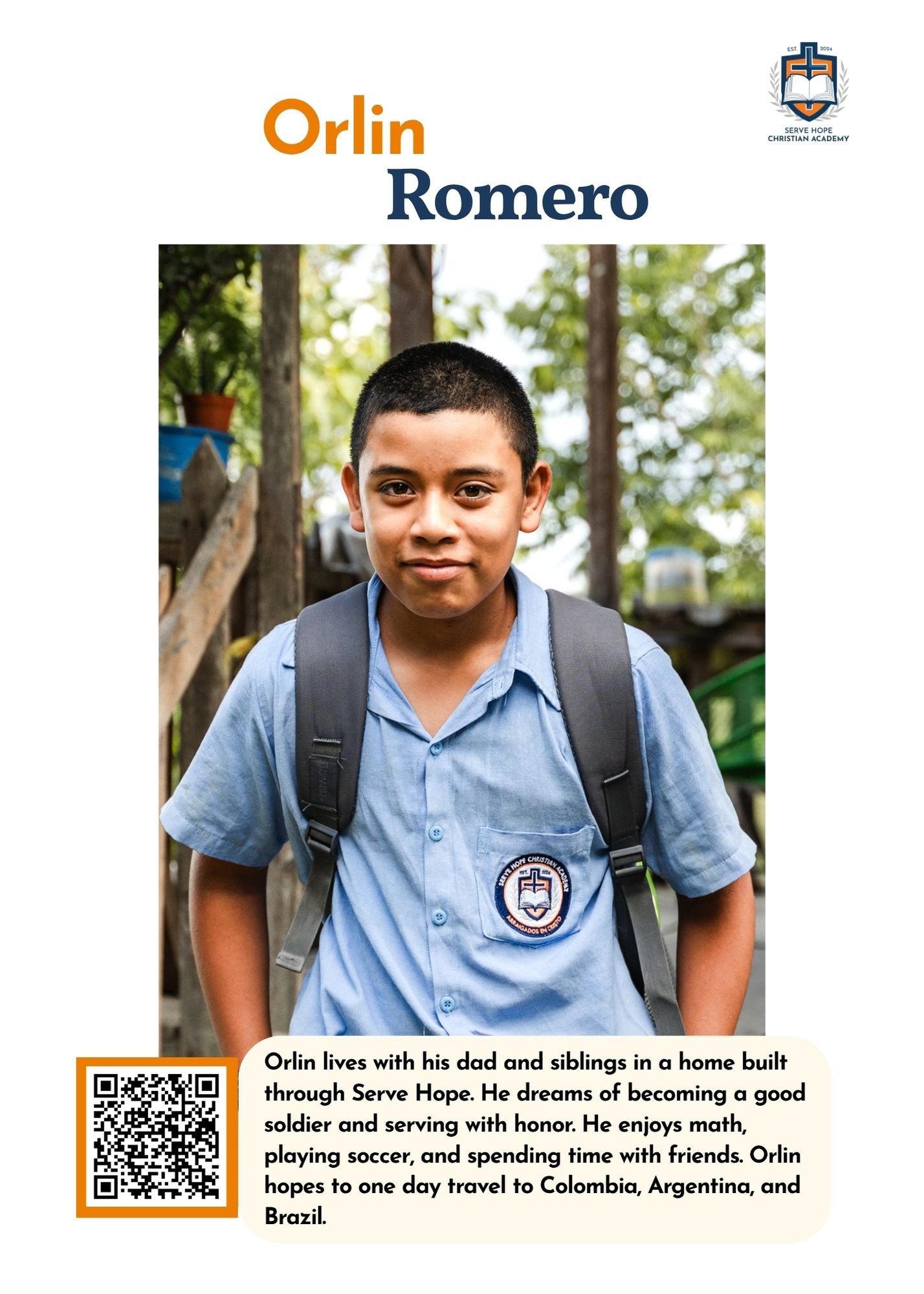 Orlin lives with his dad and siblings in a home built through Serve Hope. He dreams of becoming a good soldier and serving with honor. He enjoys math, playing soccer, and spending time with friends. Orlin hopes to one day travel to Colombia, Argentina, and Brazil.